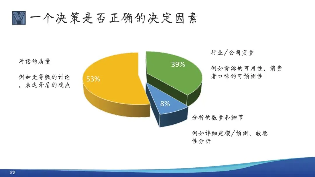 重视对话质量:对话质量(无等级讨论、表达矛盾观点)对决策正确性的影响占比53%,远超行业/公司变量(39%)和分析细节(8%)。