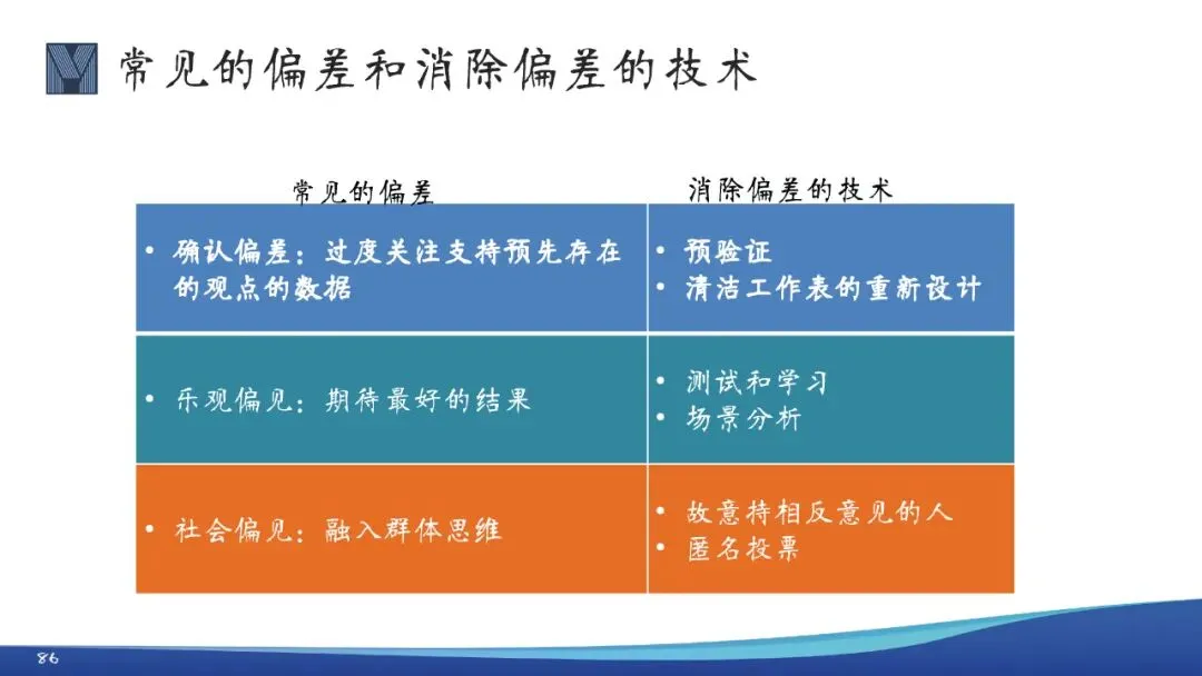 消除决策偏见:针对“确认偏差(过度关注支持观点的数据)”“乐观偏见(期待最好结果)”“社会偏见(群体思维)”,采用“预验证、场景分析、匿名投票”等技术。