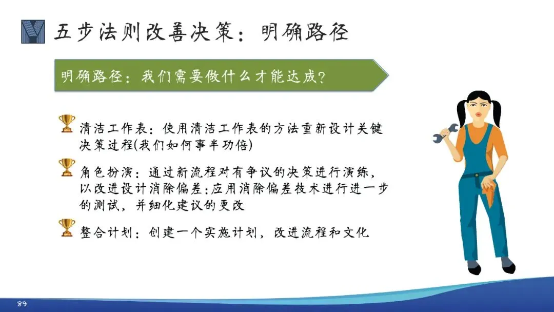 明确路径:用“清洁工作表”重新设计决策流程,演练有争议决策(测试新流程),整合实施计划(流程+文化)。