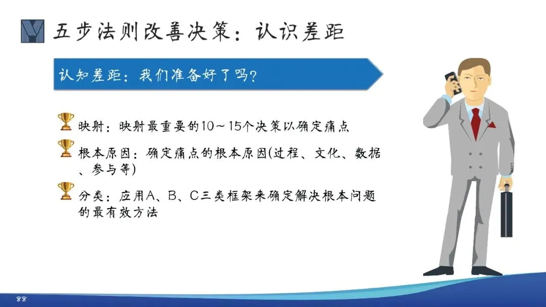 认识差距:映射关键决策痛点,分析根本原因(流程/文化/数据),用A/B/C框架匹配解决方案。