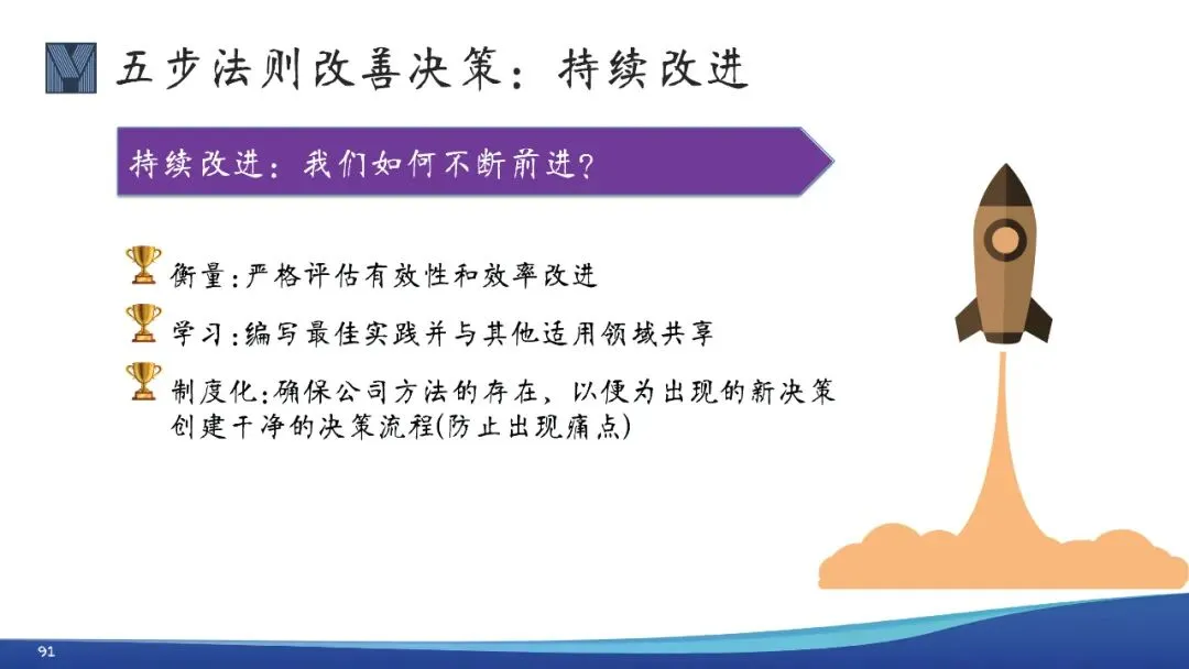 持续改进:严格衡量决策有效性(效率/质量),共享最佳实践,制度化新决策流程(应对新决策痛点)。