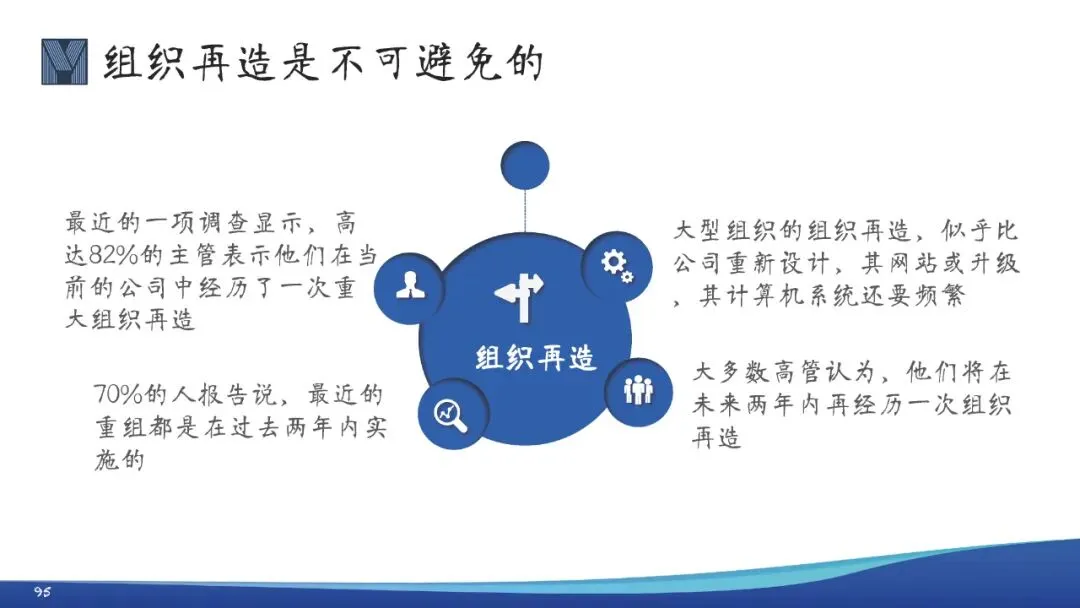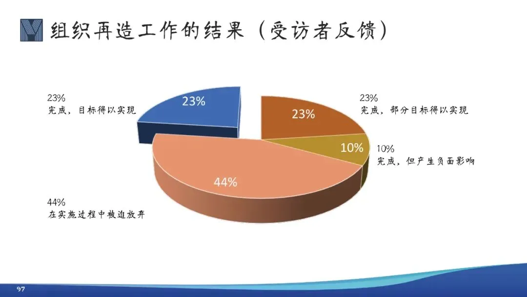成功率低:仅23%的公司能通过组织再造实现目标,44%在实施中被迫放弃,23%产生负面影响。