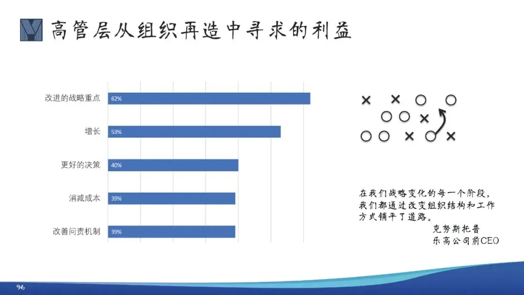 再造必要性:82%主管经历过重大组织再造,70%在过去2年内实施,且未来2年将再经历一次;组织再造可推动62%企业提升战略重点、53%实现增长。