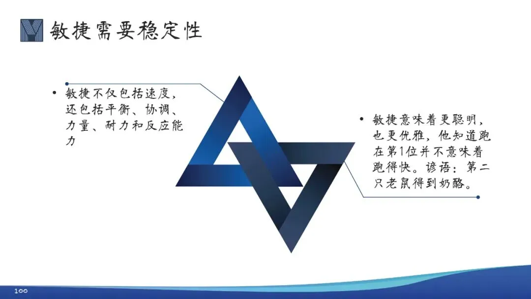 敏捷需稳定性:敏捷不是“快速无序”,需平衡“稳定主轴(长期战略愿景、核心流程)”与“敏捷元素(快速迭代、灵活响应)”。