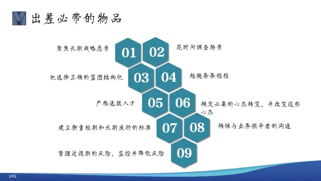 遵循9条黄金法则:聚焦长期愿景、选择正确蓝图、调查场景、超越条框、严格选才、管理过渡期风险、建立短期+长期衡量标准、推动心态转变、确保与业务领导者沟通。