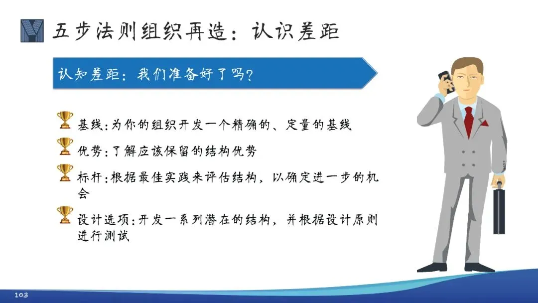 认识差距:建立组织定量基线(规模/成本/效率),识别现有结构优势,对标最佳实践,开发潜在结构方案并测试。
