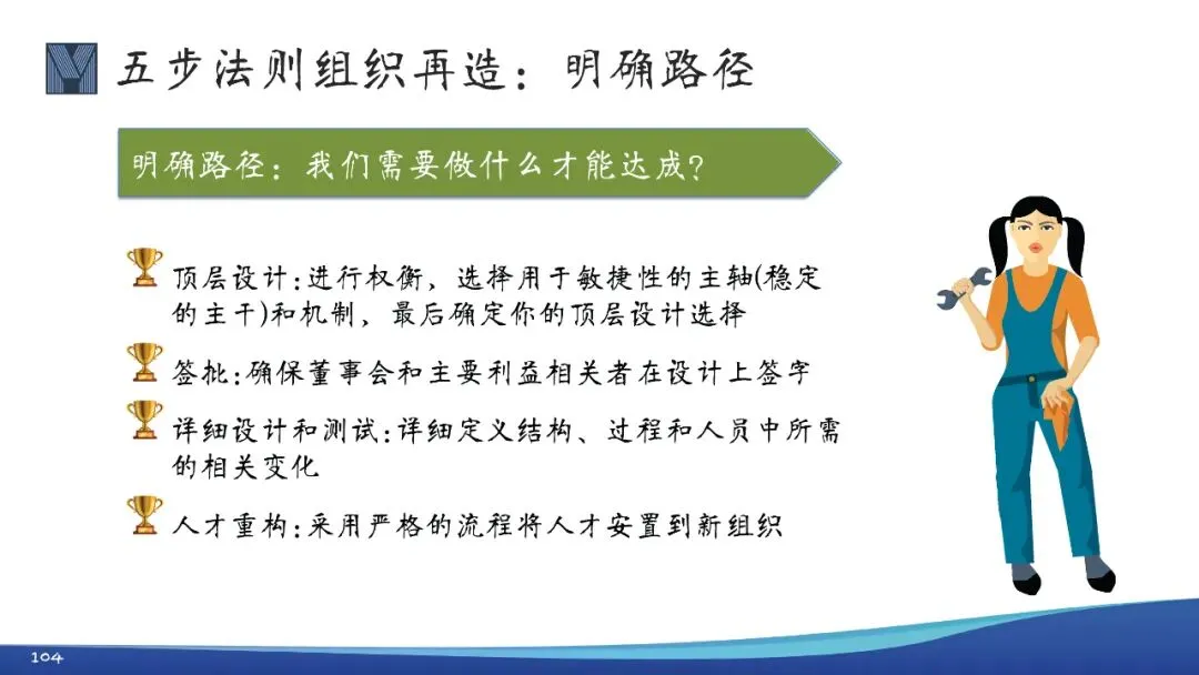 明确路径:选择敏捷主轴(稳定主干),确定顶层设计,获取董事会签批,细化结构/流程/人员变化,严格安置人才。