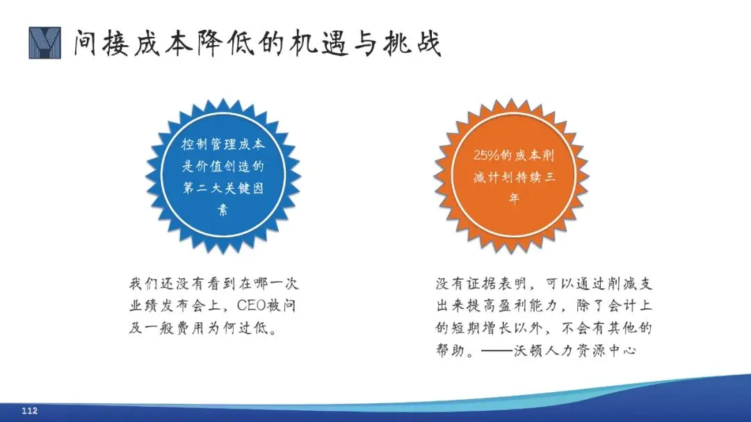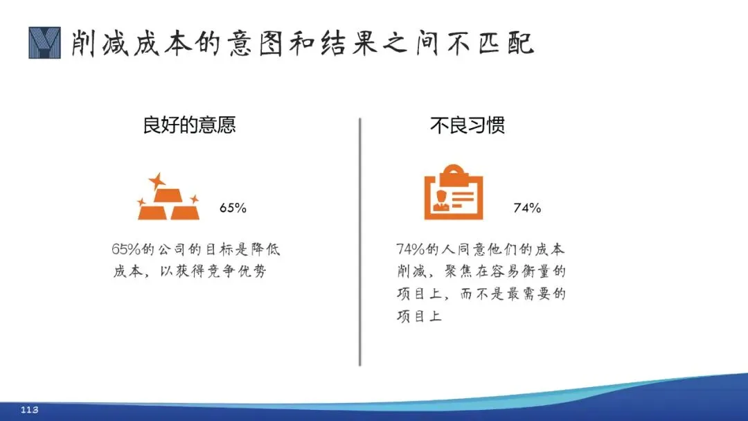 成本价值:控制间接成本(销售/营销/会计/法律等非生产性成本)是价值创造第二大关键因素;但74%企业的成本削减聚焦易衡量项目,而非最需要的领域。