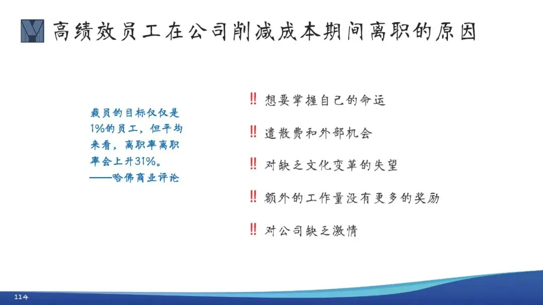 人才风险:成本削减期间,裁员目标仅1%时,离职率会上升31%,高绩效员工因“想掌握命运、对文化失望、额外工作量无奖励”离职。