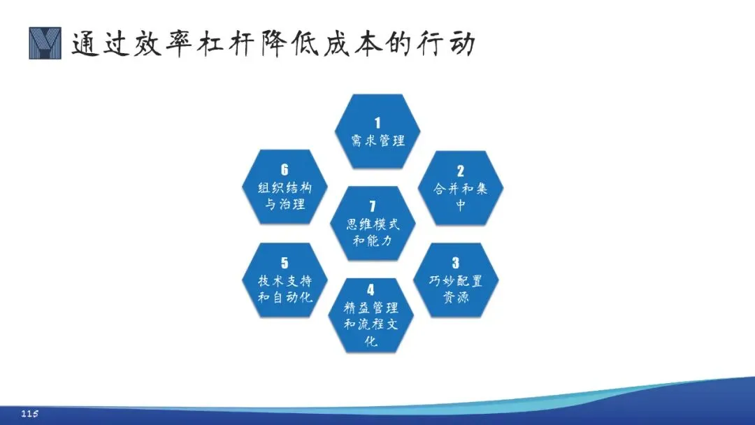 激活7个成本杠杆:需求管理、合并和集中、巧妙配置资源、精益管理和流程文化、技术支持和自动化、组织结构与治理、思维模式和能力。