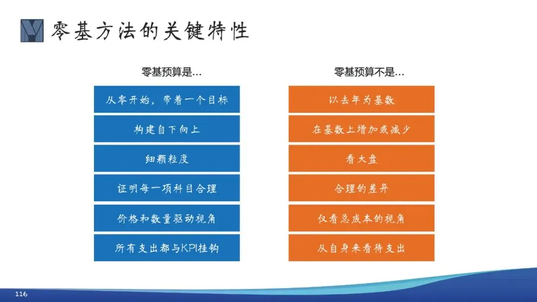 采用零基方法:从零构建预算,而非基于去年基数;需“细颗粒度证明每笔支出合理、支出与KPI挂钩、价格+数量双驱动”,避免“仅看总成本、合理差异默认”。