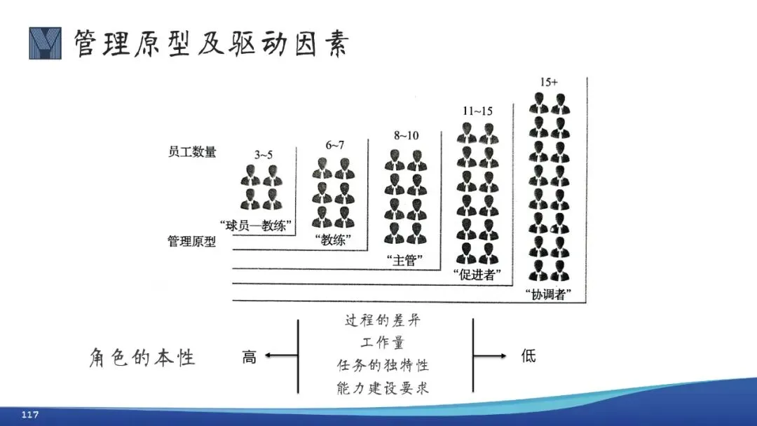 匹配管理原型:根据团队规模(3-5人→“球员-教练”、6-7人→“主管”、8-10人→“促进者”、11-15人→“协调者”)设计管理角色,平衡工作量与能力建设需求。