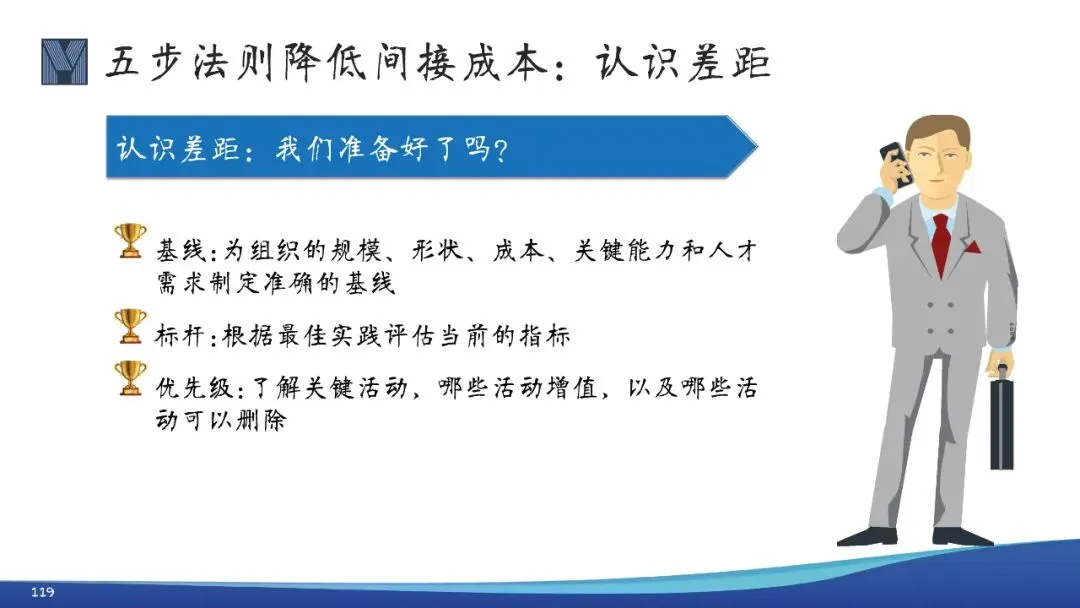 认识差距:建立组织基线(规模/成本/能力/人才),对标最佳实践,区分增值与非增值活动。