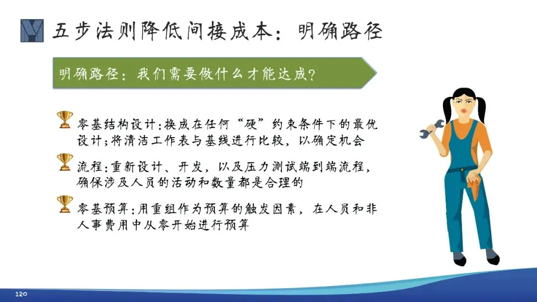 明确路径:设计零基结构(对比基线找机会),重新设计端到端流程(确保人员/活动合理),启动零基预算(人员+非人事费用)。