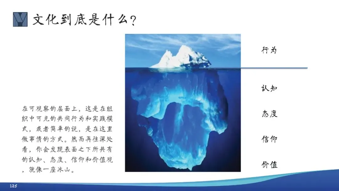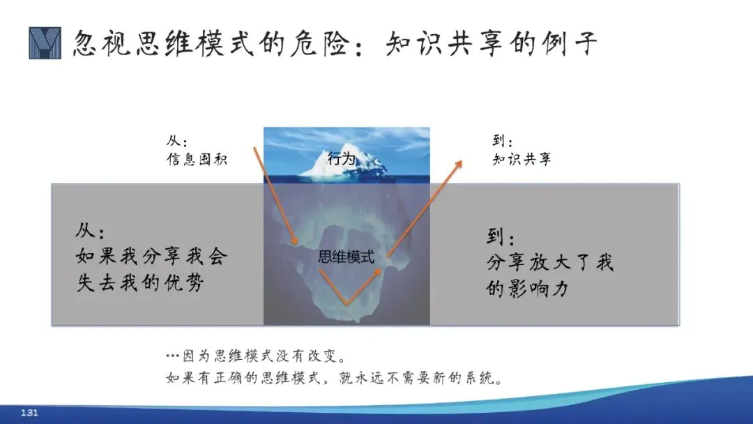 关注思维模式而非仅行为:文化是“行为+认知+态度+信仰+价值观”的冰山模型,仅改变行为(如“从信息囤积到知识共享”)而不转变思维模式(“分享会失去优势→分享放大影响力”),变革会失效。