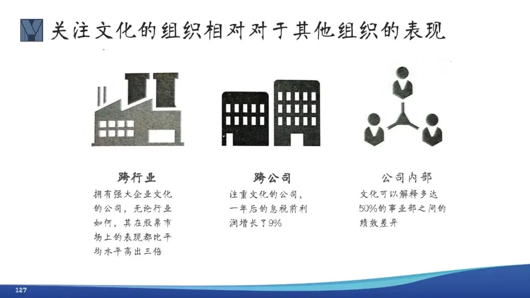 文化驱动绩效:拥有强大文化的公司股市表现比平均水平高3倍,一年后息税前利润增长9%,文化可解释50%的事业部绩效差异。