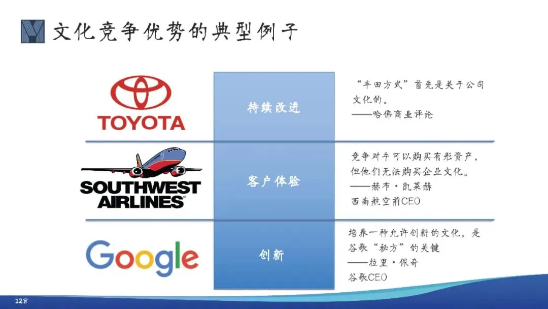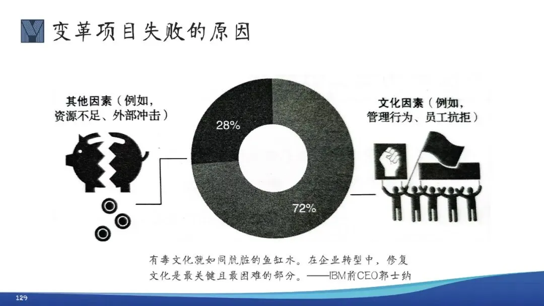 变革关键:72%的变革项目失败因文化因素(如管理行为、员工抗拒),仅28%因资源不足等外部因素;竞争对手可复制资产,但无法复制文化(如西南航空、谷歌)。