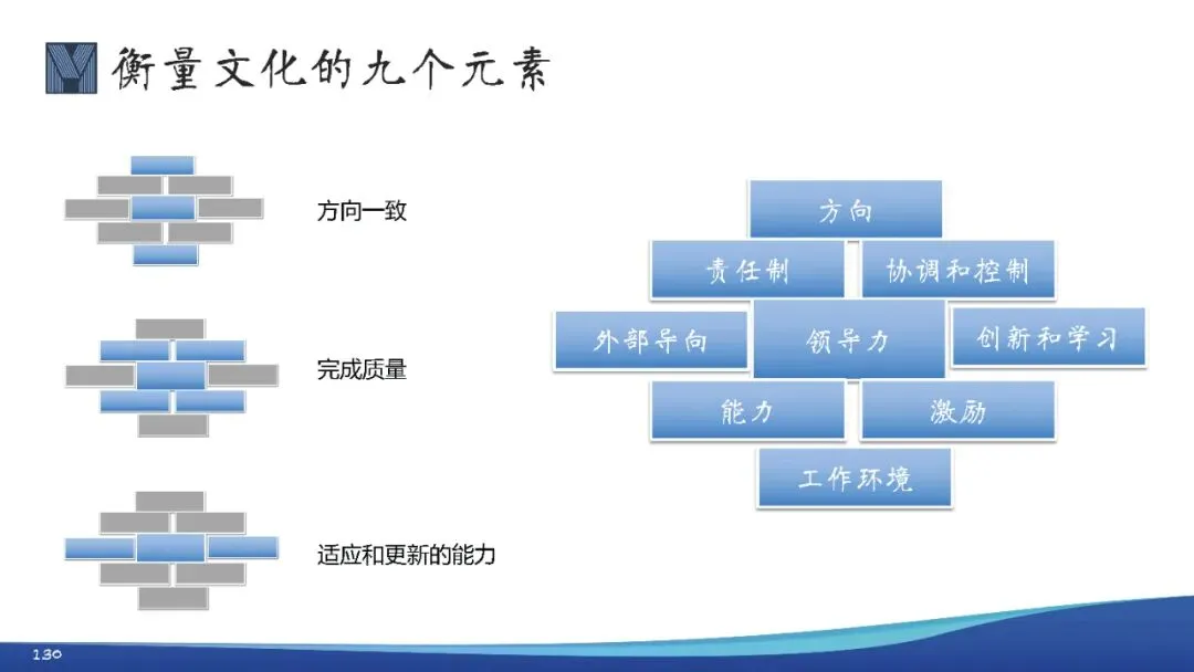 统一目标:选择文化模型与共享语言(将抽象转具体),用定量+定性基准明确起点(9个文化维度:方向一致、责任制、外部导向等),聚焦影响业务绩效的核心文化元素。