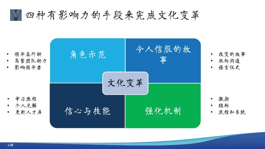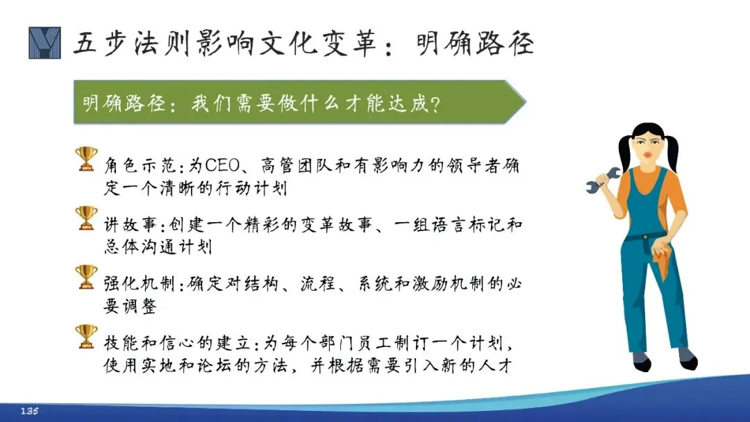 明确路径:为CEO/高管/影响者制定角色示范计划,创建变革故事与沟通计划,调整结构/流程/激励等强化机制,为员工设计能力建设计划(含人才引入)。