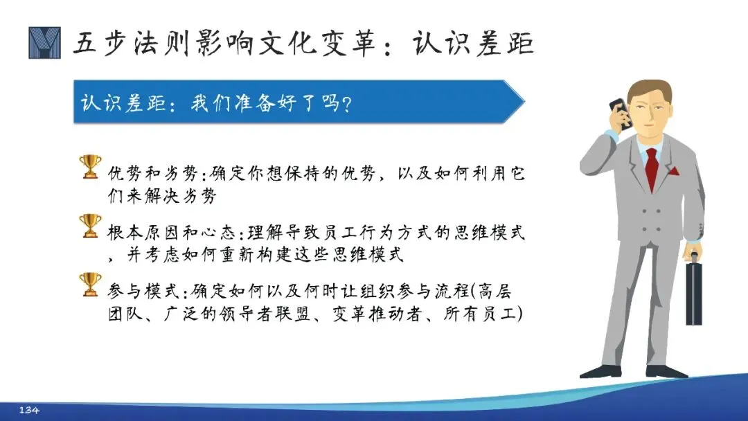 认识差距:识别文化优势(保留)与劣势(改进),分析员工行为背后的思维模式,确定组织参与模式(高管/变革推动者/全员)。
