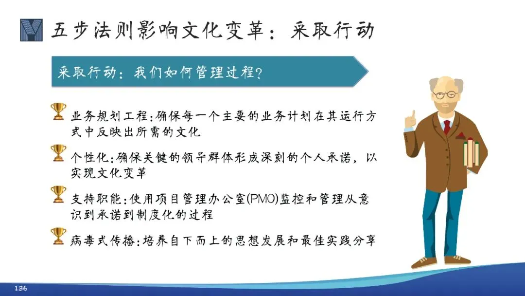 采取行动:将文化融入业务计划运行,推动关键领导群体的个人承诺,用PMO监控文化变革过程(意识→承诺→制度化),培养自下而上的最佳实践分享。