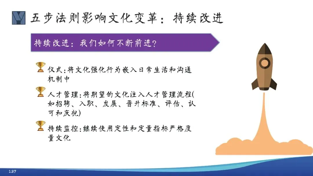 持续改进:将文化强化行为嵌入日常仪式,将文化注入人才管理全流程(招聘/入职/晋升/评估),用定性+定量指标持续监控文化变化。