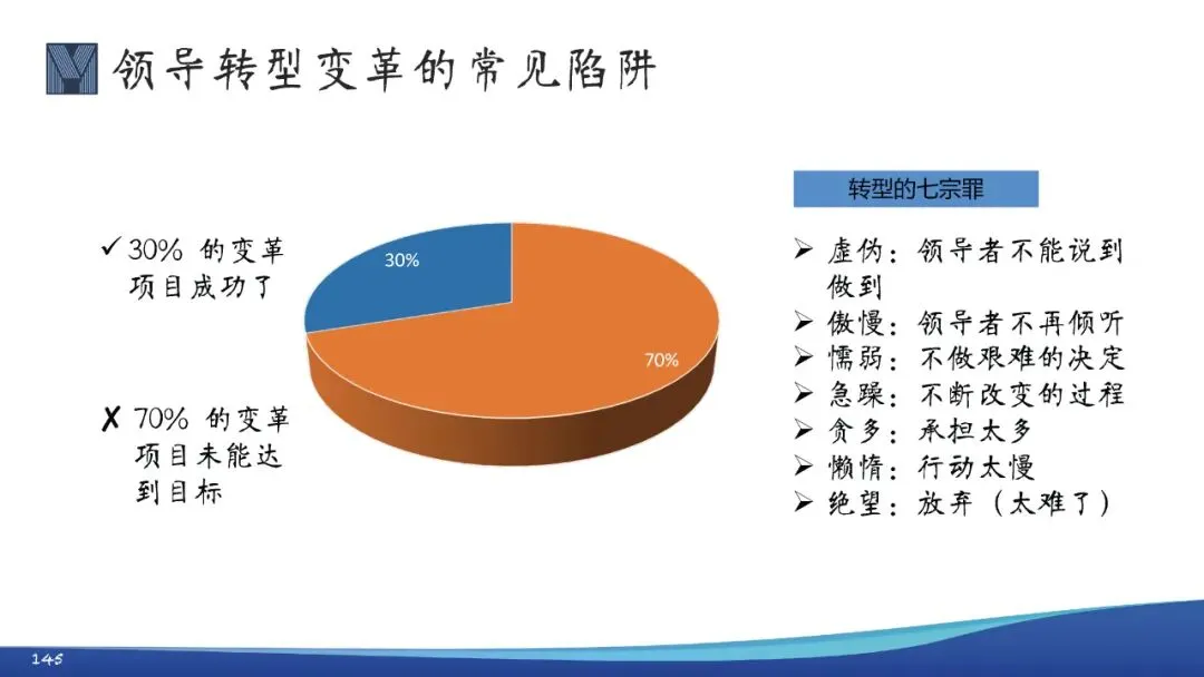 成功率低:仅30%的转型项目成功,70%失败因“虚伪(领导者言行不一)、傲慢(不倾听)、懦弱(不做难决策)、急躁(频繁改流程)、贪多(承担过多)、懒惰(行动慢)、绝望(放弃)”七大陷阱。