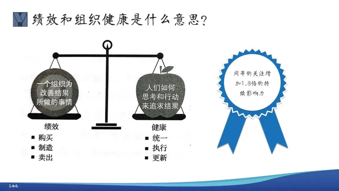 同等关注绩效与组织健康:绩效是“组织为追求结果所做的事情”(如购买、制造、卖出),健康是“人们思考和行动的方式”(如统一、执行、更新),双关注可使持续影响力提升1.8倍。