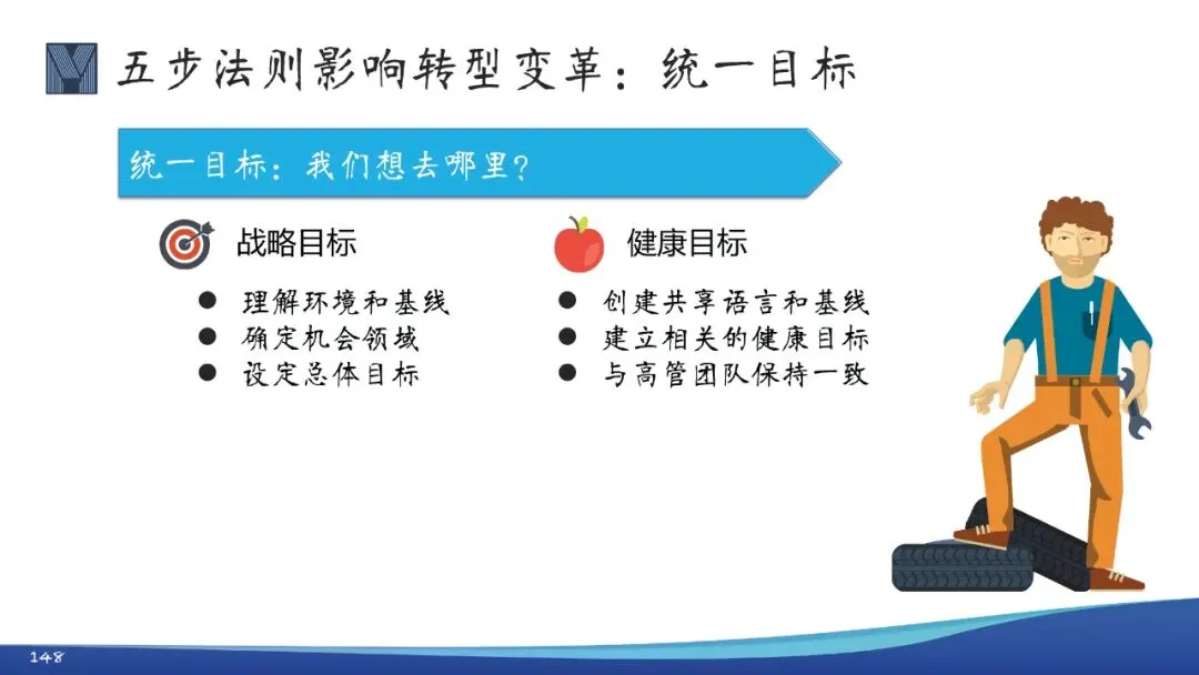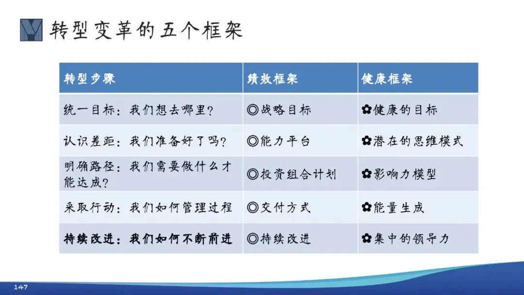 应用五个框架:转型分“统一目标→认识差距→明确路径→采取行动→持续改进”五步,每步需同步绩效与健康框架: