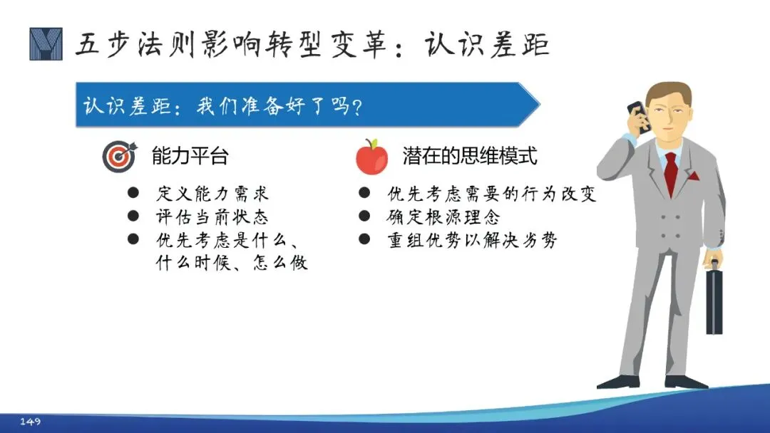 认识差距:评估当前能力平台(定义需求、现状、优先级),识别需转变的思维模式(根源理念、行为改变),重组优势解决劣势。