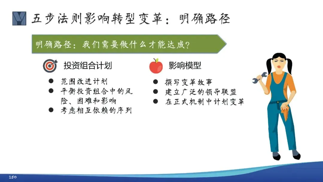 明确路径:设计投资组合计划(平衡风险与影响),撰写变革故事并建立领导联盟,在正式机制中嵌入变革计划。