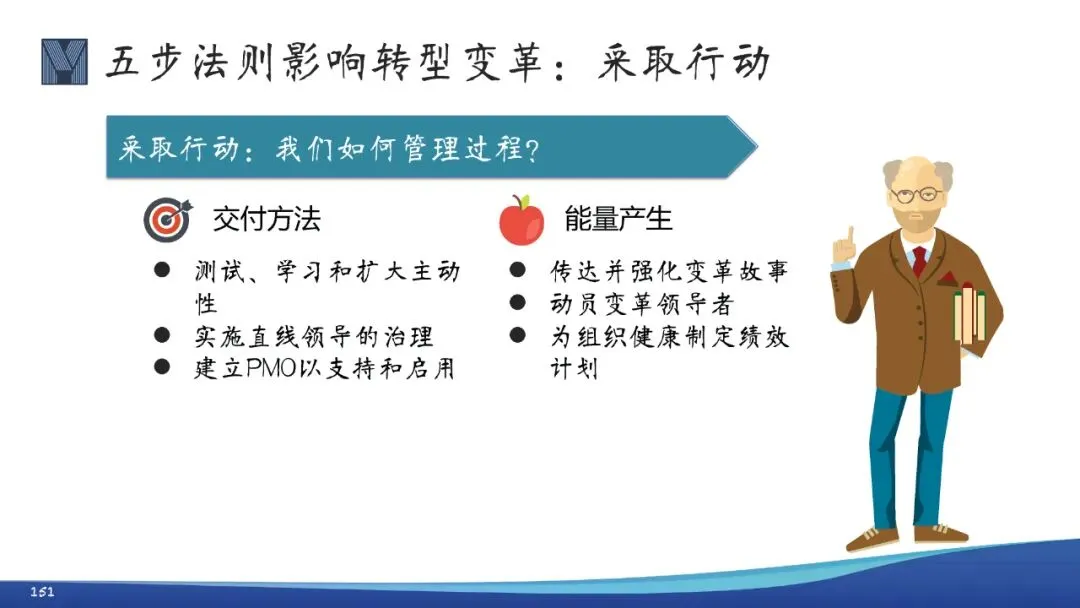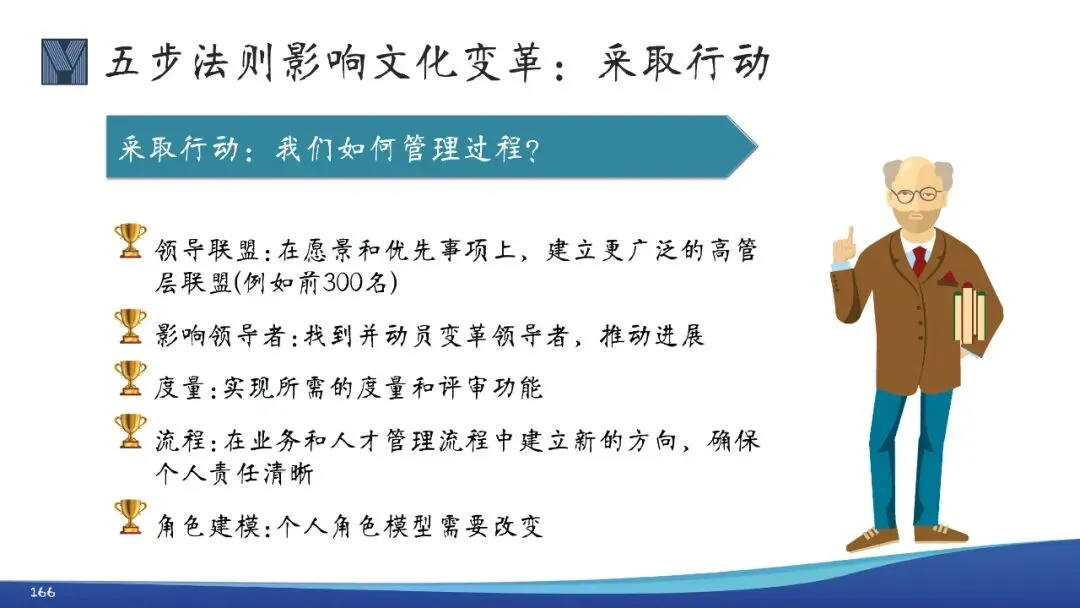 采取行动:建立高管层联盟(前300名),动员变革领导者推动进展,实现度量与评审功能,将新方向嵌入业务/人才流程,做好个人角色示范。