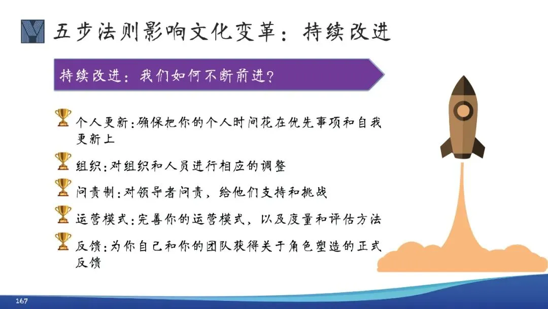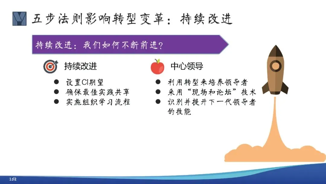 持续改进:设置持续改进期望,共享最佳实践并建立组织学习流程,利用转型培养领导者,识别并提升下一代领导者技能。