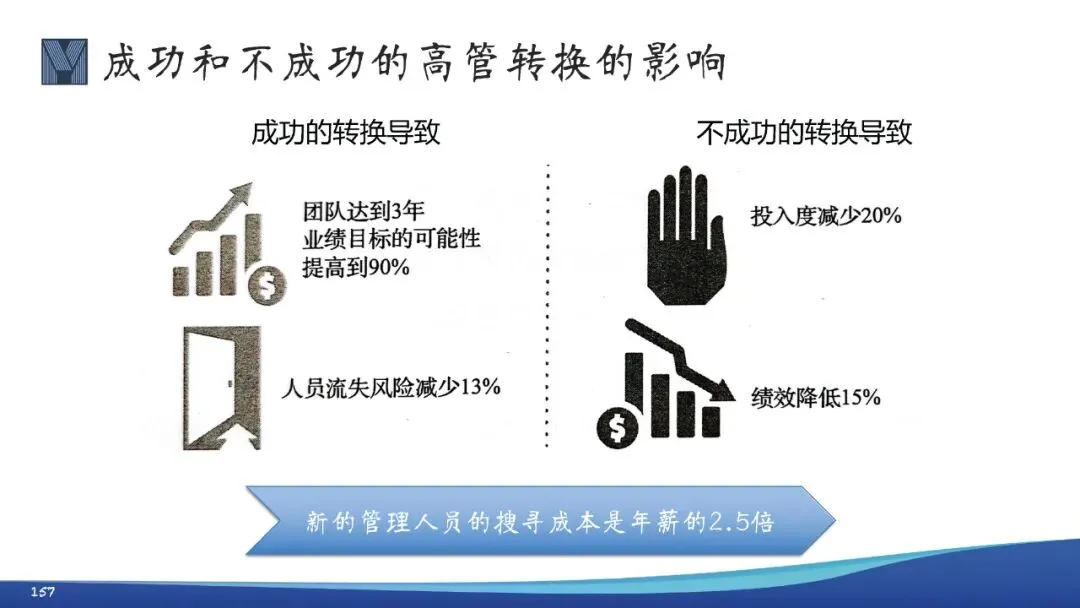 风险高:27%-46%的领导交替失败,失败导致团队绩效降低15%,员工投入度减少20%,新管理者搜寻成本为年薪的2.5倍。