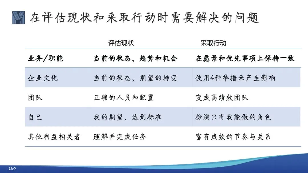 评估五大领域并行动:同步关注“业务/职能、企业文化、团队、自己、其他利益相关者”,避免单一维度发力: