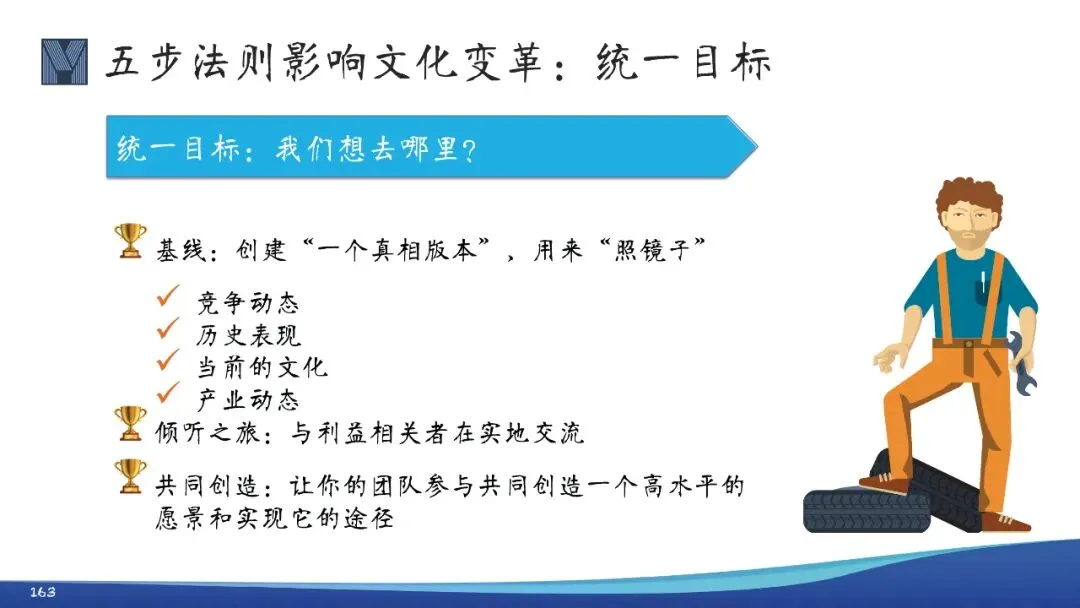 统一目标:创建“真相版本”基线(产业动态、竞争、历史表现、文化),开展倾听之旅(与利益相关者交流),与团队共同创造愿景。