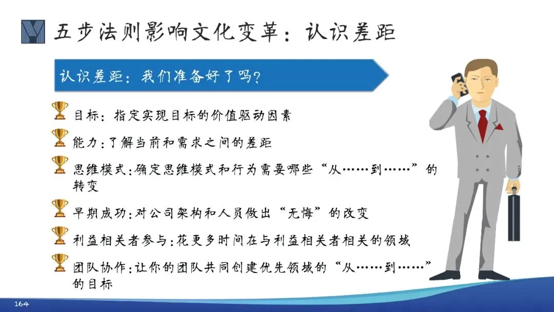 认识差距:明确价值驱动因素(实现目标的关键),分析能力差距,确定思维模式“从…到…”转变,尽早做“无悔改变”(如架构/人员调整)。
