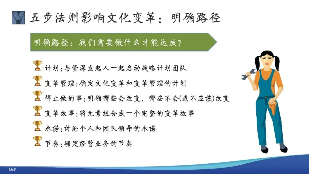 明确路径:启动战略计划团队(与资深发起人合作),制定文化变革计划,明确“停止做”事项,构建完整变革故事,确定业务节奏。