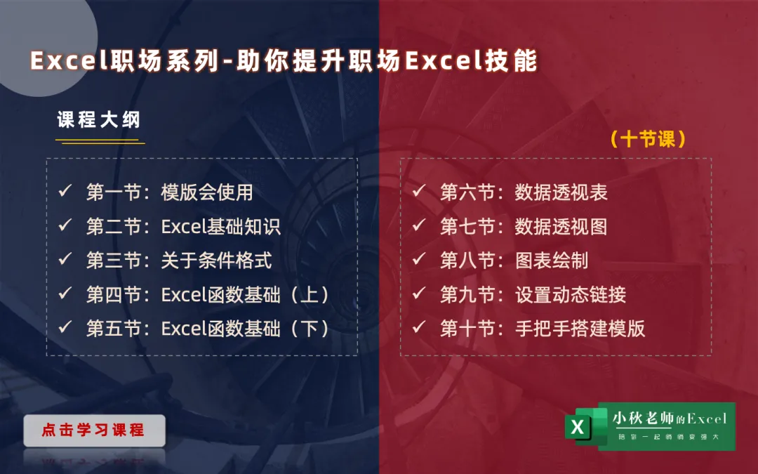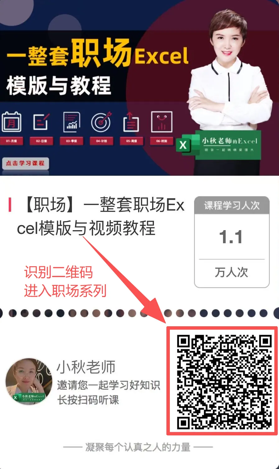• 千聊知识平台,开通后课程永久有效,支持回听,可任意时间听课学习&下载模版,不限次数 • 不限定设备,手机、ipad、电脑都可以观看,建议电脑登陆微信直接听课(建议) • 系列内【文件】格式均为模版,下载后可永久保存使用• 关注「小秋的Excel」并置顶,从底部菜单--知识店铺找到【职场】系列
