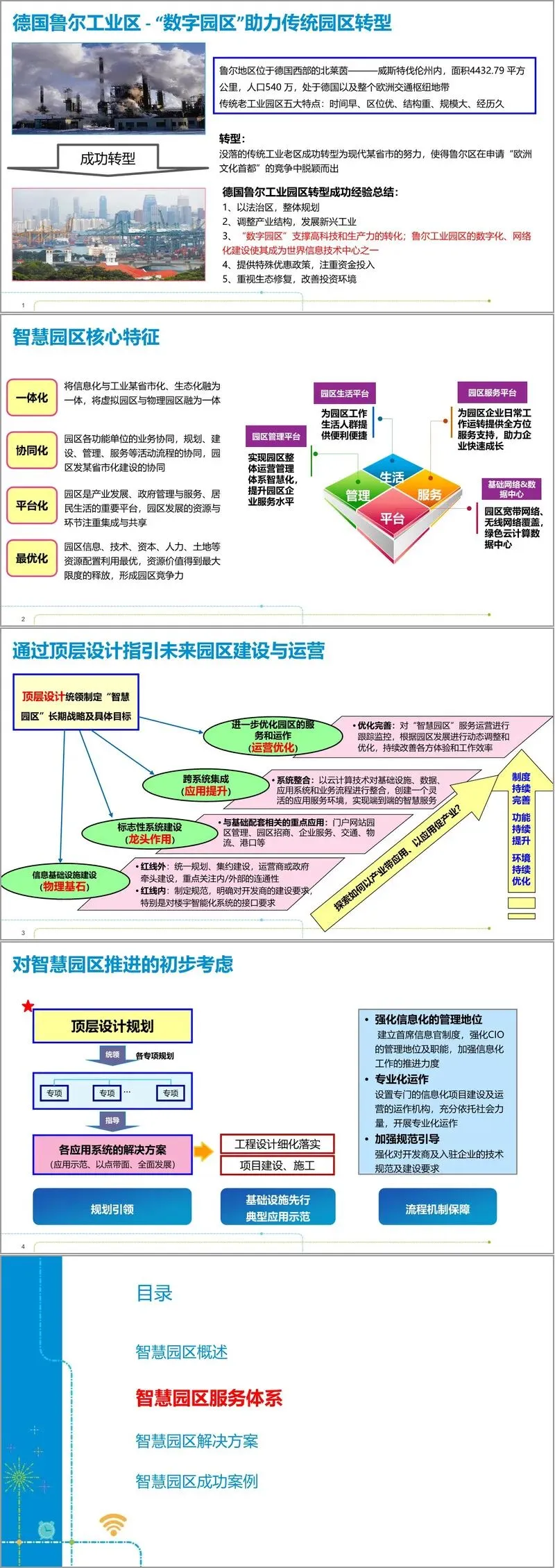 国际经验为我国智慧园区发展提供了重要借鉴。美国硅谷的创业氛围、印度班加罗尔软件园的人才储备、韩国松岛智能园区的绿色环保、德国鲁尔工业区的数字化转型,均验证了技术赋能、产业协同、生态优化的重要性。其中,德国鲁尔工业区通过 “数字园区” 建设支撑高科技转化,成功实现传统工业老区向现代都市的转型,其以法治区、产业结构调整、数字化支撑、政策扶持与生态修复的经验,为国内传统园区转型提供了宝贵参考。