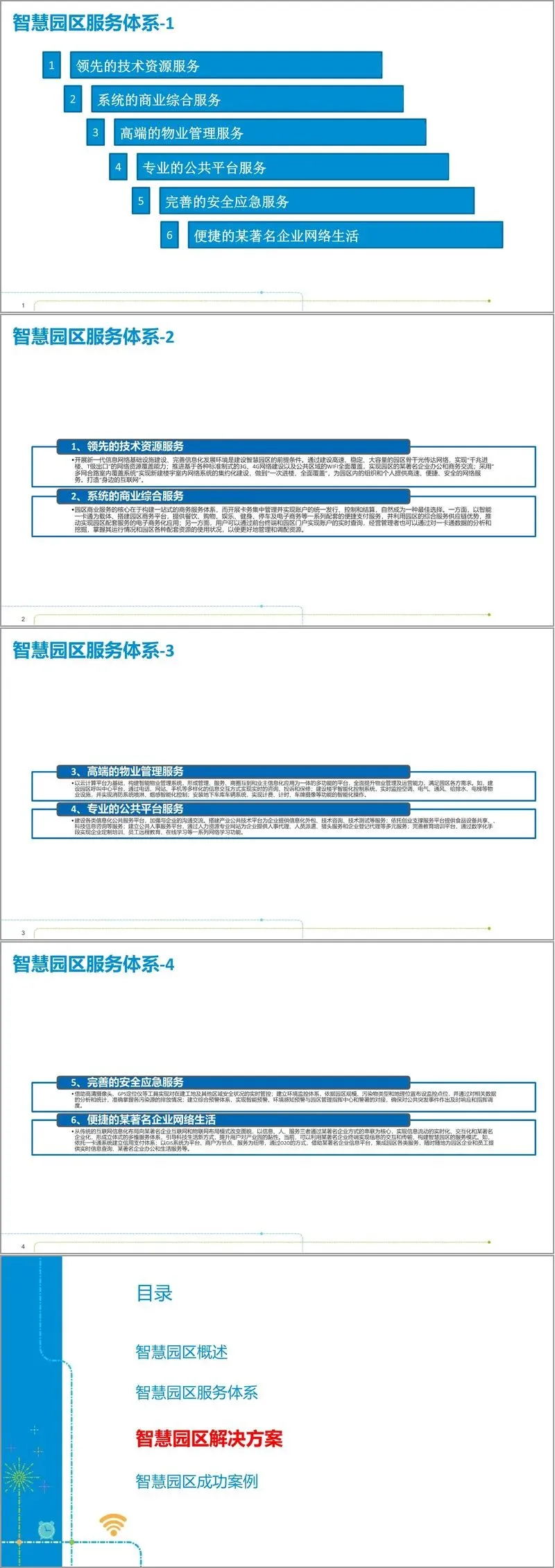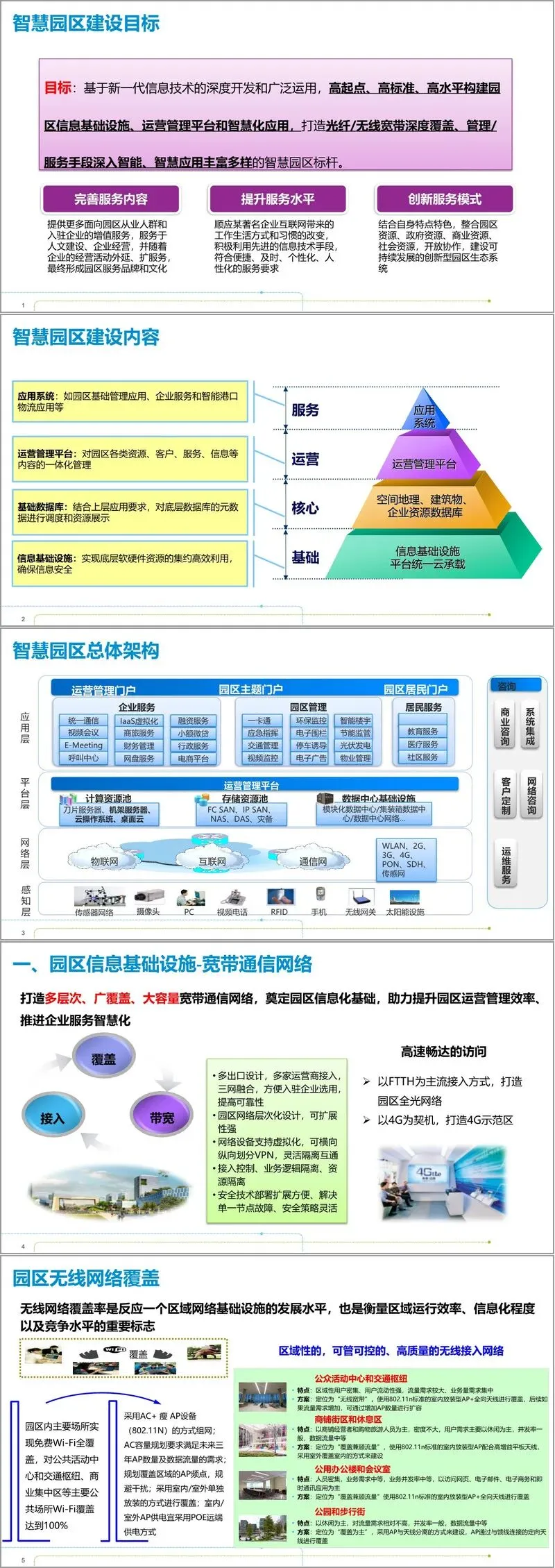 解决方案层面,智慧园区采用 “感知层- 网络层 - 平台层 - 应用层” 的总体架构,以信息基础设施为物理基石,以运营管理平台为核心枢纽,以各类应用系统为服务载体。信息基础设施方面,打造多层次宽带通信网络与全覆盖无线网络,采用 FTTH 接入与 4G 示范区建设,实现高速畅达的网络访问;云公共服务平台引入微模块数据中心,相比传统数据中心,其 PUE 更低、建设周期更短、单机架功耗更高,配合云管理系统与虚拟桌面,为园区企业提供低成本、按需使用的 IT 资源服务。