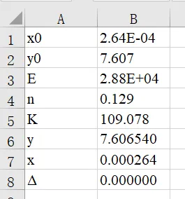 Function SolveY(x0 As Double, y0 As Double, E As Double, n As Double, K As Double, Optional initial_guess As Double = -1, Optional max_iter As Integer = 100, Optional tol As Double = 1e-10) As Double ' 求解方程: (y/E + 2*(y/(2K))^(1/n)) * y = x0*y0 ' 使用牛顿迭代法 Dim y As Double Dim f As Double, df As Double Dim iter As Integer ' 初始猜测:如果未提供,用 y0 作为初始值 If initial_guess <= 0 Then y = y0 Else y = initial_guess End If For iter = 1 To max_iter ' 计算 f(y) 和 f'(y) f = (y / E + 2 * (y / (2 * K)) ^ (1 / n)) * y - x0 * y0 ' 导数:d/dy [y^2/E + 2*y*(y/(2K))^(1/n)] df = 2 * y / E + 2 * (y / (2 * K)) ^ (1 / n) + (2 * y / n) * (y / (2 * K)) ^ (1 / n) / y ' 避免除零 If Abs(df) < 1e-15 Then SolveY = CVErr(xlErrNA) Exit Function End If ' 牛顿更新 y = y - f / df ' 检查收敛 If Abs(f) < tol Then Exit For End If Next iter If iter > max_iter Then ' 未收敛 SolveY = CVErr(xlErrNA) Else SolveY = y End IfEnd Function