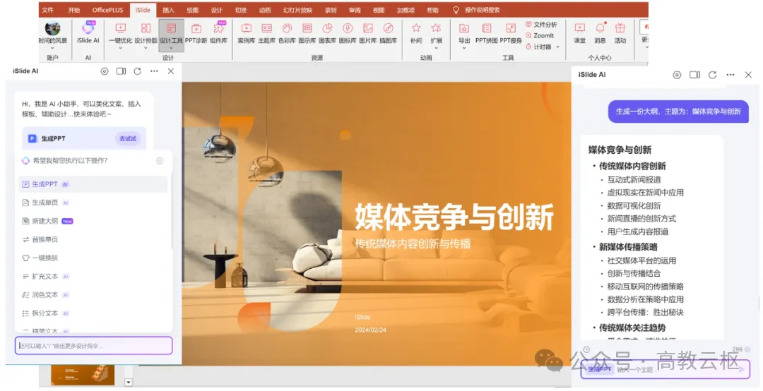 iSlide新升级增加了AI功能,可以一键生成PPT、生成单页、新建大纲、一键换肤、扩充文本、润色文本、插入图示等。