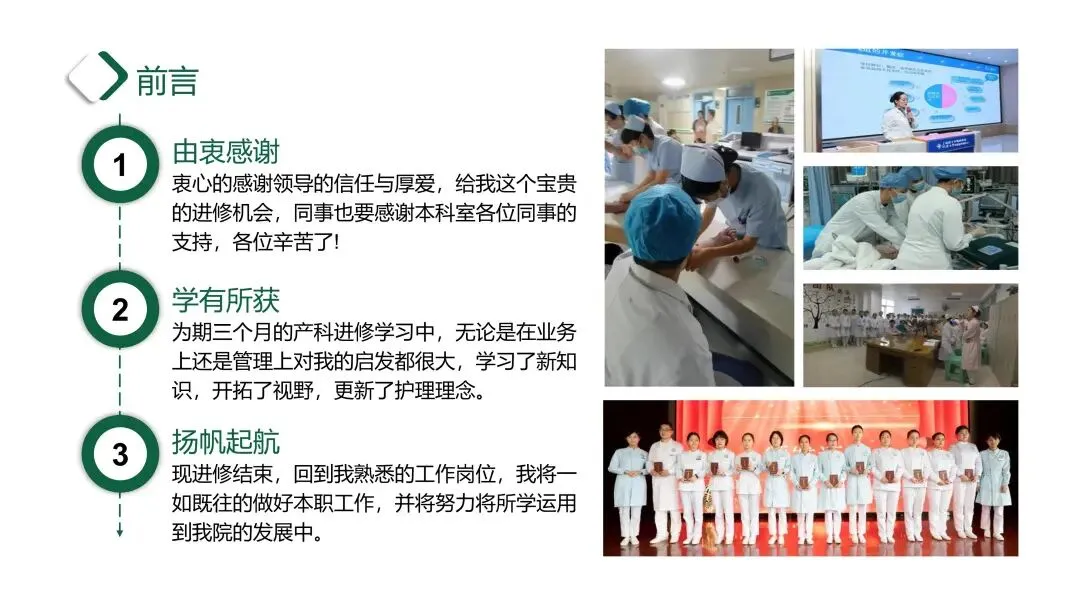 🙏前言部分包含三点内容:一是由衷感谢领导给予进修机会、同事给予支持;二是产科进修三个月在业务和管理上收获大、更新了护理理念;三是进修结束后将做好本职工作并把所学用于医院发展,右侧配有医护工作、培训、领奖等相关图片。