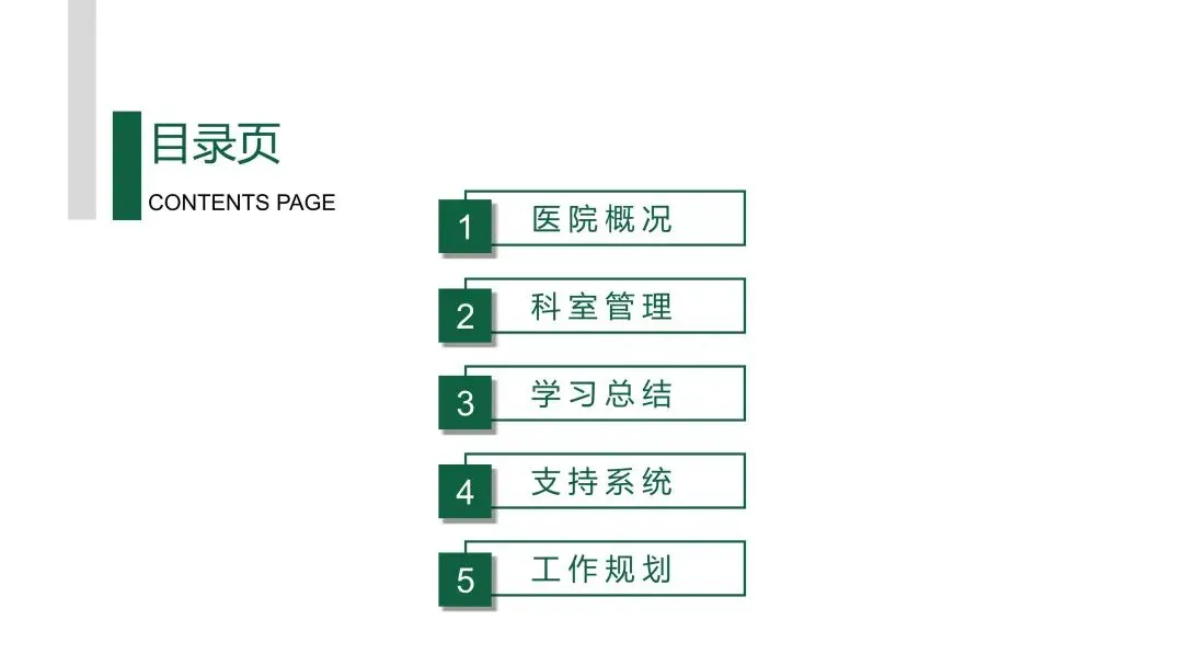 📑本PPT的目录页包含医院概况、科室管理、学习总结、支持系统、工作规划这五部分内容。
