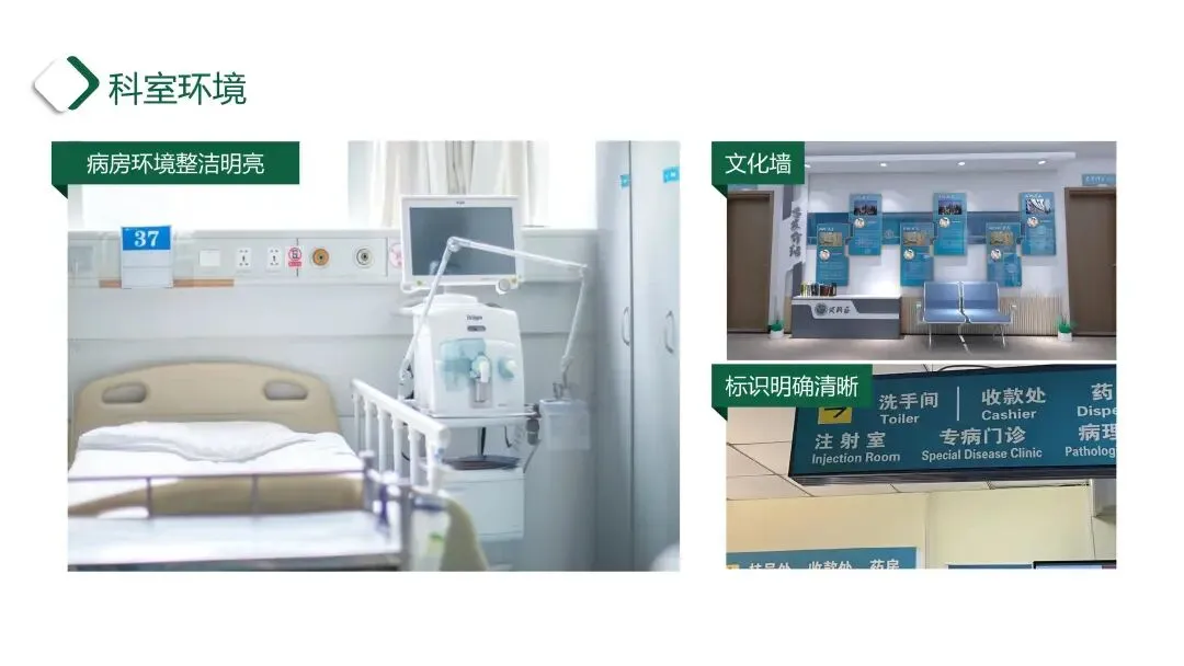 🏥科室环境展示了整洁明亮的病房、带有专家介绍等内容的文化墙以及明确清晰的标识,为患者提供良好就医环境。