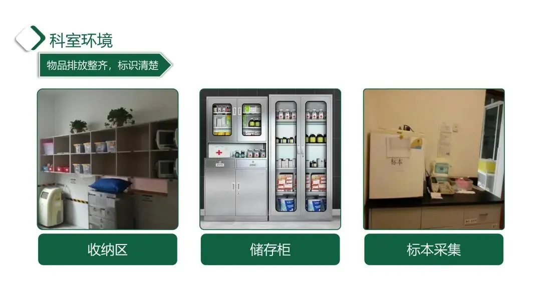 🏥科室环境中,收纳区、储存柜、标本采集区域的物品排放整齐、标识清楚。