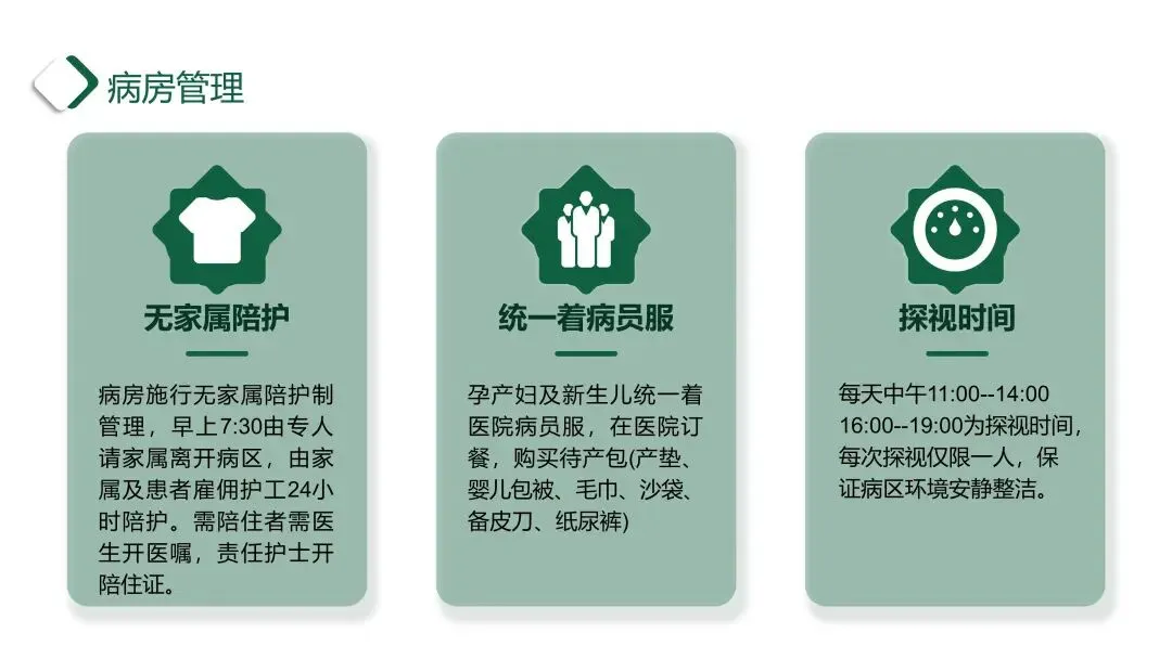 🏥病房管理包含无家属陪护(7:30家属离区、护工陪护、陪住需医嘱及陪住证)、统一着病员服(孕产妇及新生儿着病员服、医院订餐及购买待产包)、探视时间(11:00 - 14:00和16:00 - 19:00、每次一人)三方面内容。
