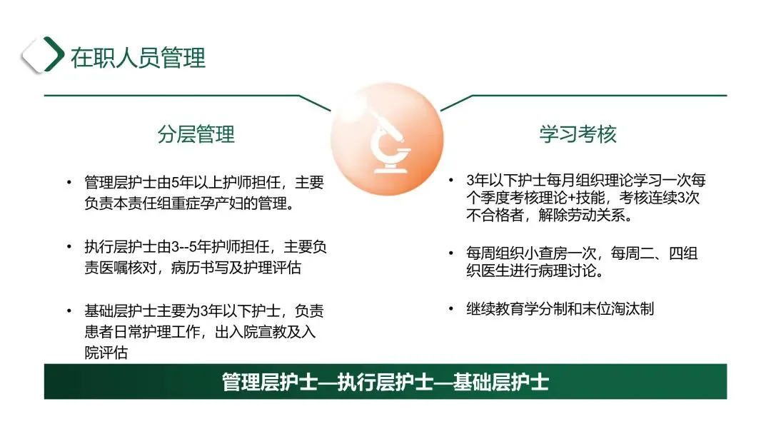 👩⚕️在职人员管理包含分层管理(管理层、执行层、基础层护士分别按要求履职)和学习考核(3年以下护士有理论学习、考核等要求,还有小查房、病理讨论、学分制及末位淘汰制)两方面内容。