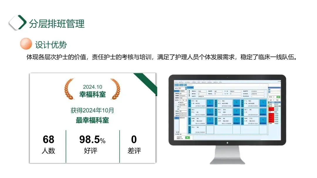 🏥分层排班管理的设计优势在于体现各层次护士价值、开展责任护士考核培训,满足护理人员个体发展需求并稳定临床一线队伍,如某科室68人、获98.5%好评且0差评还获评2024年10月最幸福科室。